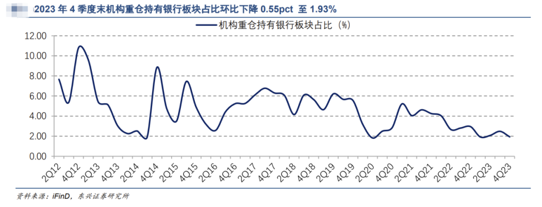 具体而言,2023年四季度末公募基金重仓持有银行板块占比环比下降至1.93%,是近十年来的低位。国有大行和农商行持仓环比略有改善,而股份制银行和城商行明显遭遇减持。在去年四季度末,包括招商银行在内的优质银行均遭遇抛售。